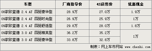 欧蓝德是三菱引入国内销售的中型SUV车型,经过09款小改款后,新款在外观上增加了冷银色换挡装饰板,镀铬门内把手,镀铬侧窗装饰物,镀铬尾门装饰条等等,同时内饰也有局部的变动和提升。根据网上车市价格监测系统显示,目前欧蓝德新老款车的优惠幅度均在2万元内,具体车型以及价格如下:
