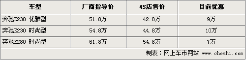 据4S店销售人员介绍,目前奔驰E级现车都较为紧张,多数是订单式的销售方式。因为E级将推出改款车型,所以目前的优惠幅度相对较大,其中E230时尚型最高优惠达到了10万元,E230降幅也在9万元,E280时尚型优惠7万元后售价仅为54.8万元。目前只有个别4S店内有少量银色和黑色现车供应,其他店均需要订车。对想购买E级车的消费者而言,现在出手是最好的时机。