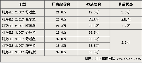 别克GL8是MPV市场一款非常受欢迎的车型,成为公司和商务用车的主要选择对象,被称为“陆上公务舱”。根据网上车市价格监测系统显示,目前这款车的优惠幅度在原来2万元基础上增加到了2.3万元,具体车型以及价格如下: