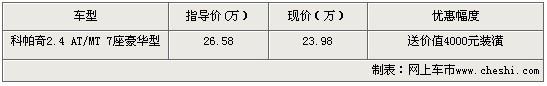 雪佛兰Captiva科帕奇不仅丰富了雪佛兰产品阵容,深化了雪佛兰年轻活力、值得信赖的国际化品牌内涵,更填补了上海通用汽车在中档SUV细分市场上的空白。近日根据网上车市价格监测系统显示,上海地区购买雪佛兰科帕奇2.4 AT/MT 7座豪华型 可以得到2.6万元的价格优惠。具体车型报价如下表:
