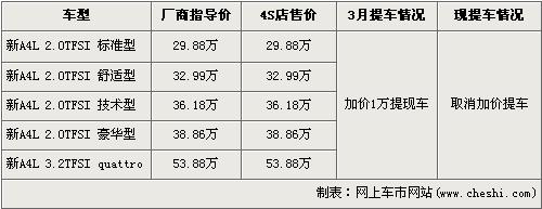 据北京地区奥迪经销店销售人员介绍,近期购买奥迪A4L的消费者可以以原厂商指导价购买,提现车不再需要多交1万元现金。在售的新A4L分为5款车型,售价分别为:2.0T标准型为29.88万元、2.0T舒适性为32.99万元、2.0T技术型为36.18万元、2.0T为38.86万元、3.2Quattro为53.88万元。销售人员还介绍,新A4L的内饰分灰色、黑色和米色三种,一般车色均配以米色和灰色内饰,只有红色车身的新A4L配以黑色内饰,店内只有红色车型数量不多,欲购买其他颜色的消费者需交定金1万元,约等1个月后提车。