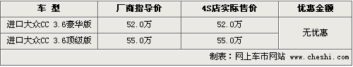 据4S店销售人员介绍,目前进口大众CC现车已经到店,共分两款车型,3.6豪华版售价为52万元,顶级版售价为55万元。这两款车主要差别体现在配置上,顶级版增加了导航和自动泊车系统等高端配置。消费者现在购车的话暂时还没有优惠幅度出现。现车方面,4S店有黑色、白色、亮银色、蓝色等可供消费者选择。内饰分别有黑色和黑米两款可供挑选。