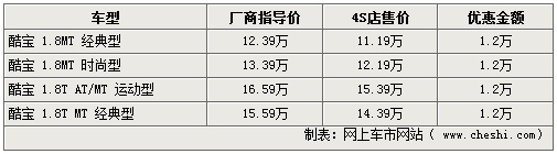 据4S店销售人员介绍,此次酷宝系列车型涉及系列内各款车型,1.8L手动时尚型及1.8T自动版运动型车型的现车各店最高可给出12000元的现金优惠。而1.8T系列车型部分颜色需要订购,优惠幅度同样可达到1.2万元;操控效果极佳的手动挡1.8L车型现车充足,享受优惠的同时还可由经销商处添置价值近千元的车身装饰,但不能折换现金。