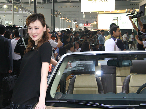 中新网7月24日电 第四届中国(广州)国际汽车展览会于2006年7月24日开幕,展会首日为只对新闻媒体和嘉宾开放的媒体日。图为新车发布会上的靓丽车模和其身后众多的媒体记者。(郜威伟)