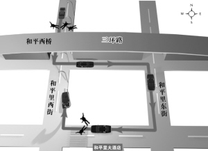 约20分钟后,该车逃窜到和平里北街的和平里大酒店对面,将行人郭燕玲(音)和其妹妹郭素云撞倒。随后,尼桑车继续快速向西行驶。在和平里北街与和平里西街交叉的十字路口,该车猛然右转,撞上路边一根路灯杆,男司机下车,弃车逃逸。