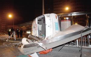 昨天(12月16日)凌晨1点,西二环主路官园桥北侧,一辆白色三菱车行驶中突然失控,撞毁路侧公交站亭后侧翻。肇事司机系酒后驾驶。