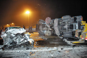 昨日凌晨4时左右,时报记者突然接到读者报料称:在天河立交最顶层,一辆油罐车和一辆小车发生碰撞,油罐车当场翻车,记者随后赶往现场,只见桥面上警灯闪烁,停着十余辆警车和交通拯救车。