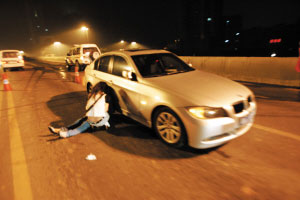一名据说是死者女友的女子开着宝马车赶到现场,听闻噩耗后瘫坐在车旁。