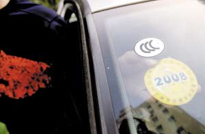 汽车贴上这种黄色标志,意味着该车属于高排放车辆。 萧嘉宁 摄