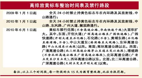 按照整治时间表,广州市估计将有26万辆黄标——高排放或高污染汽车,从2009年1月1日起,全天24小时禁止在内环路及其放射线、中山路通行。