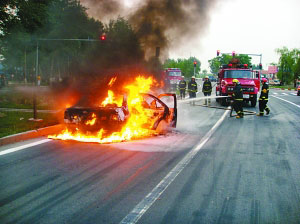 消防队员到达现场后,发现由于汽车燃烧,油箱随时有可能爆炸,在疏散周围群众后,消防战士冒着油箱爆炸的危险,经近10分钟的紧急扑救,大火被扑灭。(田北北 蔡胜彬)