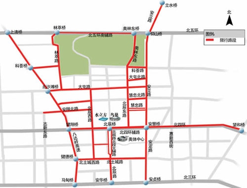 限行路段:建国门桥向北经东二环路、北二环路主路(不含辅路)至钟楼北桥(单向);复兴门桥向北经西二环路、北二环路主路(不含辅路)至钟楼北桥(单向),除奥运专用车辆、公共汽车和持有闭幕式车证的车辆外,禁止其他车辆通行。