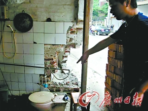 昨日上午,记者在顺德区供电局附近看到,红庙一街十五巷右边的谭氏民居与一家水果店相接的墙角,被撞出一个能钻进一个大人的洞口,水果店的一扇2米长的墙体完全开裂,谭氏民居内的马桶被撞后成了碎片,门边的一堵墙体也撞倒了,屋里到处是砖头。此时,巷子左边一家磨具店的老板得知店外出事后,却怎么也打不开卷闸门,最后通过“武力”撬开门后才发现大门外部已被撞瘪。
