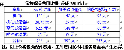 仅从配件的费用来看,帕萨特领驭1.8T和荣威750的价格优势明显,考虑到上海大众保养工时收费较高,综合看来,荣威750使用3年在保养费用的支出上最具优势,而凯美瑞240G不但配件价格昂贵,据了解保养一次的工时收费在200元左右,是三款车型中最贵的,日常使用成本较高。