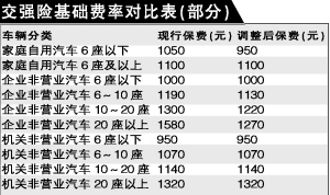 目前,初步方案定为:在12万元责任限额下,交强险基础费率按车型不同将有不同幅度的下调,8大类42种车型中将有16种下调基础费率,降幅从5%~33%不等,其中普通家庭用车的交强险保费拟由现行的1050元下调至950元,降幅9.5%,而赔偿限额提高一倍,从现行6万元提高至12万元。