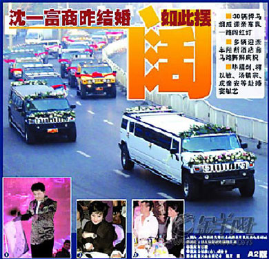 片断回放:11月24日上午7时许,沈阳市铁西区沈辽中路西部汽配城路段,一个自西向东行驶的车队迎面驶来,一辆丰田霸道越野车(录像车)行驶在车队前面,随后是一白一黑两辆加长悍马越野车,再往后就是并排行驶的悍马越野车和丰田霸道。这些车的前后车牌都贴上了“百年好合”字样,挡住了车牌号。悍马打着双闪一路向东,甚至连红灯都毫不理会一闯而过。这场婚礼由中央电视台主持人毕福剑主持,包括柯以敏、成奎安、汤镇宗等在内的明星纷纷登台献艺。