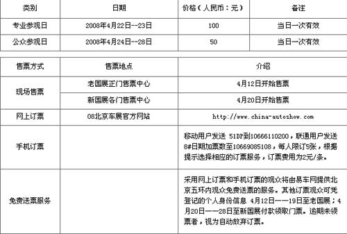 免费送票服务:采用网上订票和手机订票的观众将由易车网提供北京五环内观众免费送票的服务。其他订票观众可凭登记的个人身份信息 4月12日——19日至老国展;4月20日——28日至新国展付款领取门票。逾期未领票者,视为自动放弃订票。