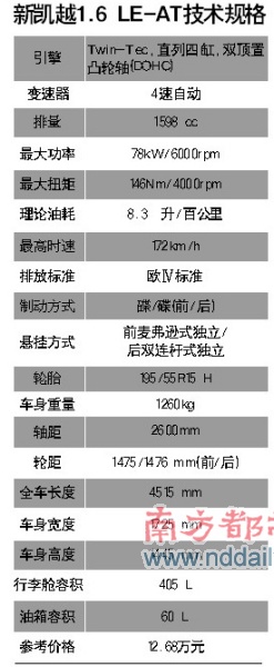 新凯越沿用了旧款车型的动力系统,不过经过重新调校之后,其1.8升和1.6升DOHC16VTwin-Tec引擎都达到了欧IV排放标准。我们此次试驾的车型配备了1.6升发动机,在6000转时可达到78kW的最大功率;在3600转时,提供146Nm的最大扭矩,在同级车型当中表现居中。传动系统上,与这款1.6升四缸引擎相匹配的是一台锯齿形排列的4速自动变速箱。从厂家提供的资料上看,为了获得更好的经济性能,这款变速器配备有“智能切换空挡”功能。
