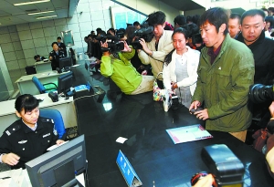 8点20分,早已准备就绪的车管民警打开警戒线的一端,允许排在最前边的两位市民进入。在大门口,两位民警先是简单审核了车主的手续,然后在一张单据上扣上了“001”的红戳。这也意味着,虽然是车主自发编的号,也得到了车管所的绝对认可。两人审核完毕后,沿着车管所院内用警戒线隔出的一条仅容一人通过的通道走到业务大厅门前。此时,排在后边的人才依次进入。