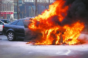 昨天上午9时许,一辆奥迪车行驶至车公庄西路中国船舶大厦楼前时突然起火,过往司机纷纷从车内拿出灭火器进行扑救,但无济于事。