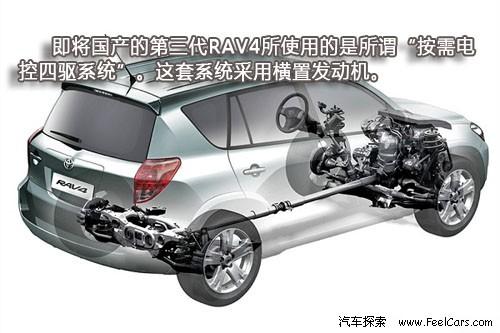 但值得注意的是,之前两代RAV4采用的都是全时四驱系统,与此相配合发动机也使用了纵置的设计。而即将国产的第三代RAV4所使用的是所谓“按需电控四驱系统”(Electronic On-DeMand 4-wheel drive)。这套系统采用横置发动机,在需要时通过液力粘性耦合器将动力传至后轮。