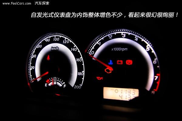 比较梦幻的是绚丽的仪表。黑色的表底下白色泛出的刻度以及红色的指针很是显眼。面积虽然不大,但为整个内饰都呈现出一种比较有档次的效果。上面的挡板保证了其自发光的设定时刻都不会因为阳光的原因而影响读取信息,当然如果面积更大一些的话,那感觉就会更好一些。