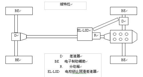 超级维特拉装备了一套中央差速器(含LSD限滑差速器),并配有前后差速锁。该车的4种四驱模式——N、4H、4H LOCK、4L LOCK,能通过旋钮进行模式转换,是一款拥有不错越野能力的全时四驱车型。4H用于铺装路面的正常行驶,此时中央差速器是开放的,四驱系统正常情况下以后驱为主,只有必要情况下才会通过可滑动式等速联轴节向前轮分配更多的动力,借此提升日常的油耗表现。4H LOCK模式下,中央差速器被锁止,因此前后轴动力以50:50平分,保证在前轮或后轮打滑情况下的脱困能力。4L LOCK模式下,除了中差被锁之外,扭矩在1.97:1低齿比加力挡的作用下可以被放大近一倍 。