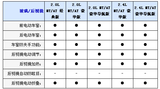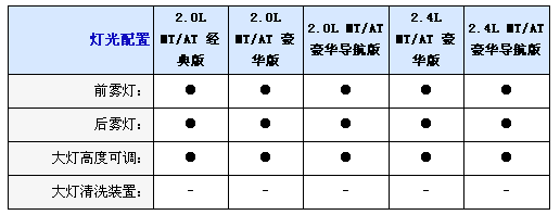 此次推出的10款新车全部配备卤素前大灯并且带有大灯手动高低调节功能,后尾灯标配LED灯组并且配备高位刹车灯,2.4L车型将会使用镀铬格栅和2.0L车型前脸将会有一定的区别,另外入门级车型即经典版车型不带天窗;其它车型为标配,2.4L所有车型标配顶部行李架;但是2.0L车型则不会配备。