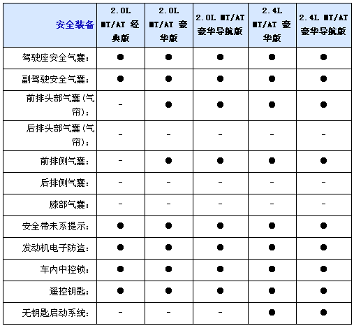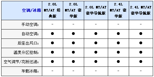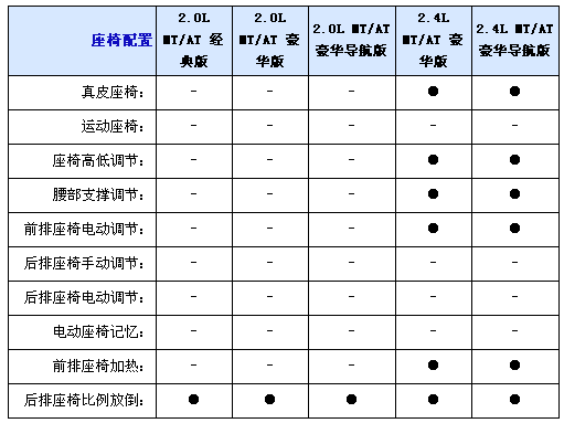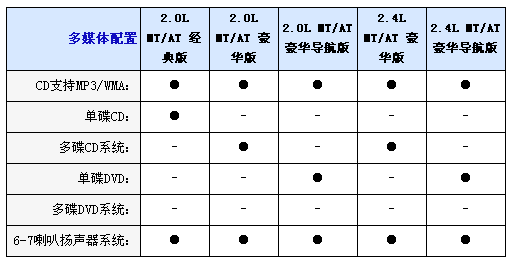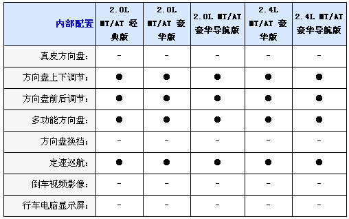 内饰方面2.0L均配备织物座椅,而2.4L车型则采用真皮坐椅并且配备电加热座椅,并且2.0L配备6向手动调节驾驶座椅,而2.4L配备8向电动调节并且代腰部支撑的驾驶座椅,不过副驾驶全车系只标配4向手动调节座椅,另外入门级车型只配备CD播放器,2.0L和2.4L豪华型采用6CD播放器,而2.0L和2.4L豪华导航型配备DVD播放器和6.5寸宽屏液晶显示器;包括导航功能,全系标配6喇叭扬声器、多功能方向盘自动分区空调和后排足部出风口。