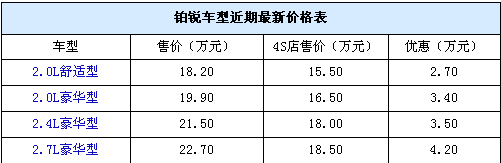 我们汽车之家独家了解到有关铂锐车型的最新优惠措施。近日,庞大汽车集团下属的北京冀东通4S店独家买断了一批铂锐车型,并以非常低的价格进行销售: