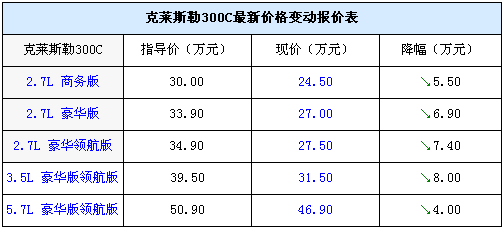 目前克莱斯勒300C现车状况一般,不同经销商处现车数量及车型颜色不同,从我们了解的情况来看现300C全系最高优惠8万元左右,2.7L低配车型的价格仅为24.5万元,优惠最大的3.5L豪华领航版售价31.5万元,性价比不错,感兴趣的朋友可以与经销商联系,来店详谈价格还能再低一些。