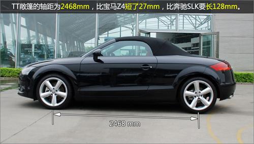 奥迪TT敞篷的轴距为2468mm,与另外两个来自德国的竞争对手相比,奥迪TT的轴距比宝马Z4短了27mm,比奔驰SLK要长128mm。