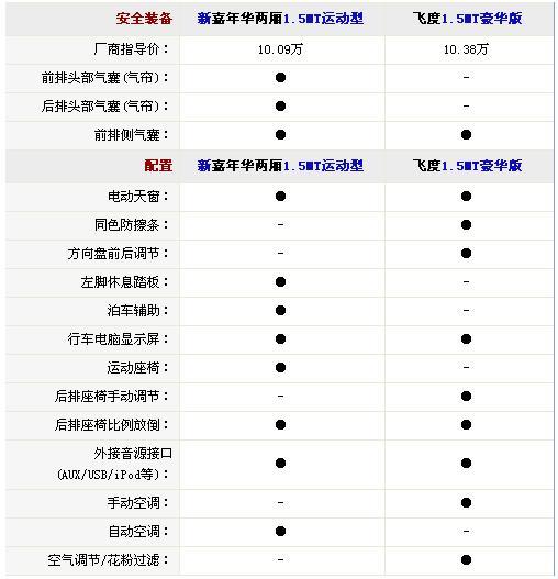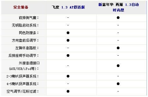 对应飞度1.3MT手动型的是新嘉年华1.3MT时尚型,两者价格相差3900元,新嘉年华以一项主要的被动安全配置出——即前排侧气囊。此外,还多出了外接音频接口和两个扬声器,少了方向盘前后调节、后排座椅角度可调以及花粉过滤。