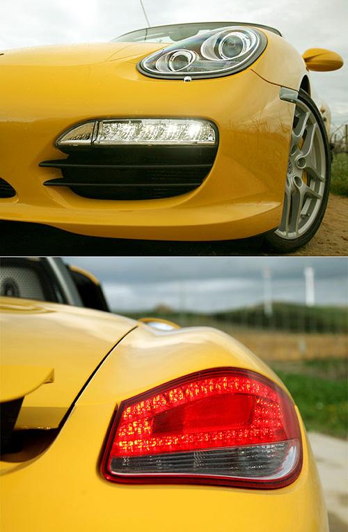 Boxster这次的小改款工程,与2008年911小改款工程极为相似,LED灯饰的改变,是这次外观上最大的变化。前保杆下方的进气口,在上缘处加入了一排白光LED的日间行驶灯,让整个车头的风格,与911呈现家族的一致性。而后方灯组的外围,同样加上了一组高亮度LED,让剎车制动的警示效果更佳,在夜间的辨识度亦大幅的提升。