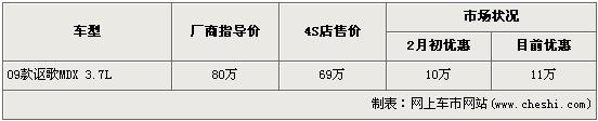 据讴歌经销商销售人员介绍,讴歌08款MDX已经停止进口现车已卖完,以后也不会再引进。目前在售的为讴歌09款MDX车型,09款讴歌-MDX的优惠现已加大到11万元,优惠后售价也从原厂商售价80万降到了69万,跌破了70万元。销售人员还介绍,09款讴歌MDX增加的实用性的配件包括前下护板和后下护板,能避免恶劣路况对底盘带来的损伤,并且09款讴歌MDX还新增了巴厘海蓝和摩卡褐金两种颜色,店内现车非常充足,颜色也比较全,欲购买者挑选的空间非常大。