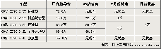 据沃尔沃4S店销售人员介绍,目前销售的沃尔沃XC90均是09款新车,其中2.5T帆船纪念版车型和3.2两个排量车型可优惠现金3万元,其他2.5T标准版和4.4旗舰版没有优惠。现车方面,4S店有蓝色款现车供应,个别款颜色需要消费者先行预定。
