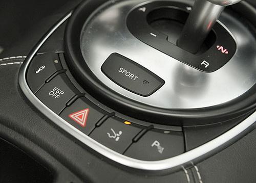 排档座后方的“SPORT”按键,则是拉高驾驭感官的关键之一。在一般情形下,R tronic变速箱处于“Normal”模式,以着重舒适的逻辑进行档位切换,换档时间较长。而按下“SPORT”按键,变速箱则转为运动模式:在A档位下,换档时间会明显增快,换档逻辑也以拉高转速为标准;而在手动模式下,此时档位切换的间隔接近0.1秒,离合器的接合也更加直接;此外驾驶员也能随心所欲的拉高转速直至自动断油,变速箱均不会主动介入进行升档,将带来完整纯粹的激情体验。