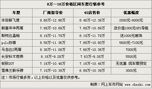 三、8万—10万之间汇集了众多明星级车型,也是众多合资品牌竞争最为激烈的阵地。新上市的新嘉年华两厢、斯柯达晶锐、标致207都是最好的证明。这个区间车型外观亮眼个性,内饰空间和操控性各方面表现各异。新飞度、雨燕省油好看,马自达2、劲情操控不错,嘉年华和晶锐期待在市场上有更好的表现,每款车各有所长,跑在大街上绝对是一道靓丽的风景。