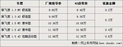 据广州本田北京地区4S店销售人员介绍,新飞度 1.5L炫酷运动版的优惠金额为6000元。新飞度在售车型分为1.3L及1.5L共5个车型在售,1.3L手动舒适版的优惠金额为2000元,现售价为8.48万元。1.3L自动舒适版的优惠金额为3000元,现售价为9.38万元。1.5L豪华版的手动和自动车型经4000元优惠后,现售价分别为10.08万元和10.98万元,1.5L炫酷运动版的优惠6000元,现售价为12.38万元。销售人员还介绍,目前1.3L的车型店内无现车,欲购买车需交1000元订金,约等半个月才可提车。