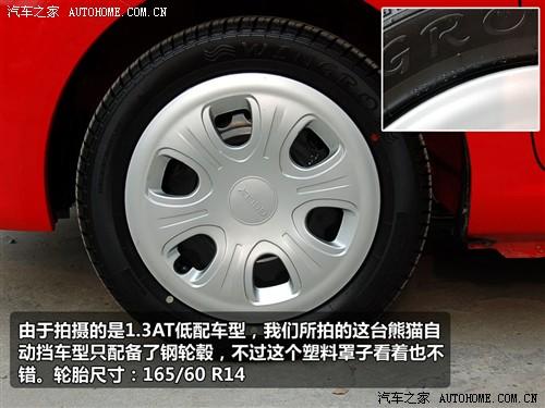 我们所拍摄的熊猫1.3L AT低配车型配备的是大小为14英寸的佳通轮胎,铝合金轮毂也理所当然的没有配备,不过低配熊猫的这款塑料外壳做的还算精致,配在165/60 R14的熊猫车胎上并不显得突兀。