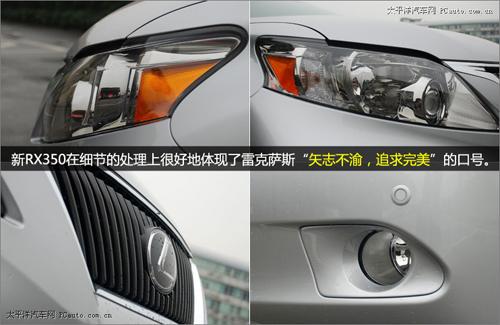 超细的面板间隙体现出新RX350在做工上的精益求精。这不禁让我想起了雷克萨斯的广告语“矢志不渝,追求完美”。鹰眼大灯与ES350颇为神似,炯炯有神。