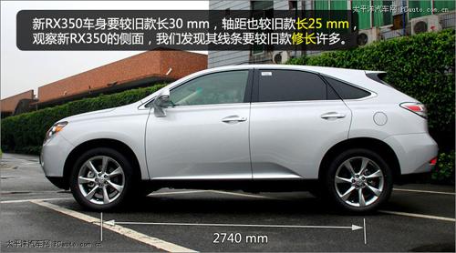 新RX350车身要较旧款长30 mm,轴距也较旧款长25 mm。观察新RX350的侧面,我们发现其线条要比旧款修长许多,一改旧款车型给人的臃肿之感。