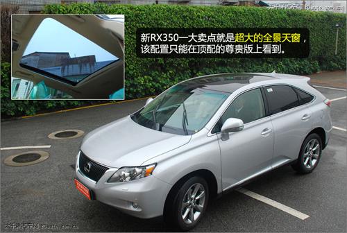 从高处俯瞰新RX350,长890 mm,宽800 mm的全景式天窗映入眼帘。这样的设计可以让后排乘客也可充分享受到阳光的滋润。值得一提的是,该项配置仅可在售价达85.2万元的RX350尊贵版上看到。