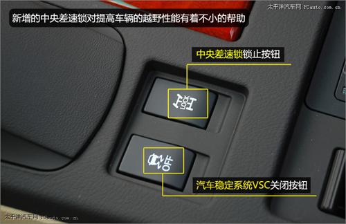 在排档杆的后方,是中央差速锁锁止按钮和汽车稳定系统VSC关闭按钮。汽车稳定系统VSC相当于德系车常见的ESP系统,对于稳定高速行驶的车辆有着很大的帮助。此外,新RX350还标配了上坡辅助系统HAC、防抱死制动系统ABS配制动力辅助系统BA、电子制动力分配系统EBD、牵引力控制系统TRC、汽车动态中和管理系统VDIM,可以给驾驶员和乘客以最好的保护和辅助。