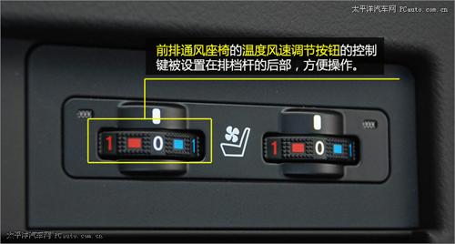 前排通风座椅的温度风速调节按钮的控制键被设置在排档杆的后部,方便操作。在夏天极为炎热的广东地区,该项功能显得非常实用。