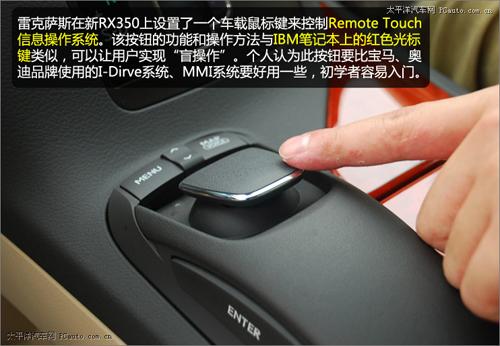 雷克萨斯在新RX350上设置了一个车载鼠标键来控制最新的Remote Touch信息操作系统。该按钮的功能和操作方法与IBM笔记本上的红色光标键类似,可以让用户实现“盲操作”。只需轻轻摆动该按钮,车载电脑屏幕上的鼠标键便会按照指示移动。个人认为此按钮要比宝马、奥迪品牌使用的I-Dirve系统、MMI系统好用一些,初学者也容易入门。据悉,这套控制系统将逐步推广到雷克萨斯全系车型上。