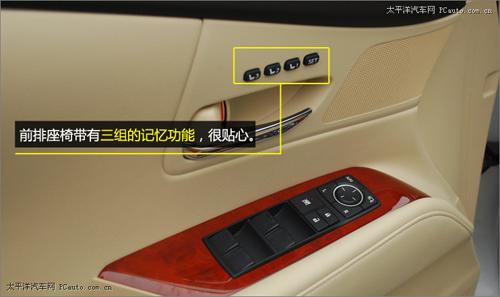 将目光转移到中央扶手侧,我们发现雷克萨斯的前排座椅带有三组记忆功能,很贴心。电动后视镜调节按钮、车窗升降按钮亦集中在驾驶员一侧的门把手上。