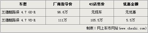 据经销商销售人员介绍,丰田-兰德酷路泽分为4.0L和4.7L两种排量,由于4.0L车型的尾气排放是欧III标准,没有达到北京施行的欧IV标准,所以北京限卖,店内没有4.0L车型。4.7L车型分为GX-R版和VX-R版,目前低配的4.7L GX-R车型没有现车,所以不在此次优惠的行列中。高配的VX-R版经5.5万元优惠后的售价也降到了105.5万元。