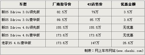 据经销商处销售人员介绍,近期购买X5的消费者可以得到最高26.6万元的优惠。新款的宝马X5 3.0L车型目前有买车送一半购置税的活动,购置税优惠的价值可以直接抵车价,经抵价转换后,新X5 3.0i领先版和豪华版经3.5及3.8万元优惠后售价降为了79万元和85.7万元,新宝马X5 4.8i车型目前仍然没有优惠。销售人员就介绍,老款的X5 4.8i豪华版有26.6万元的高额优惠,售价从173.6万元降到了147万元。