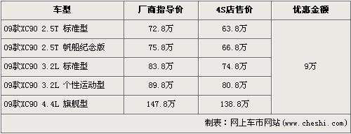 据沃尔沃经销商处销售人员介绍,目前店内的09款XC90车型全系都有9万元的现金优惠,并且此次优惠活动截止到7月1日。经优惠后,2.5T标准型的售价跌破70万元,仅售63.8万元。2.5T 帆船纪念版经9万元优惠后,售价从75.8万元下降到了66.8万元。两款3.2L排量车型经优惠后售价降为74.8万元及80.8万元,顶配的4.4L旗舰车型售价降为了138.8万元。销售人员还介绍,XC90全系车型齐全,消费者挑选的空间较大。